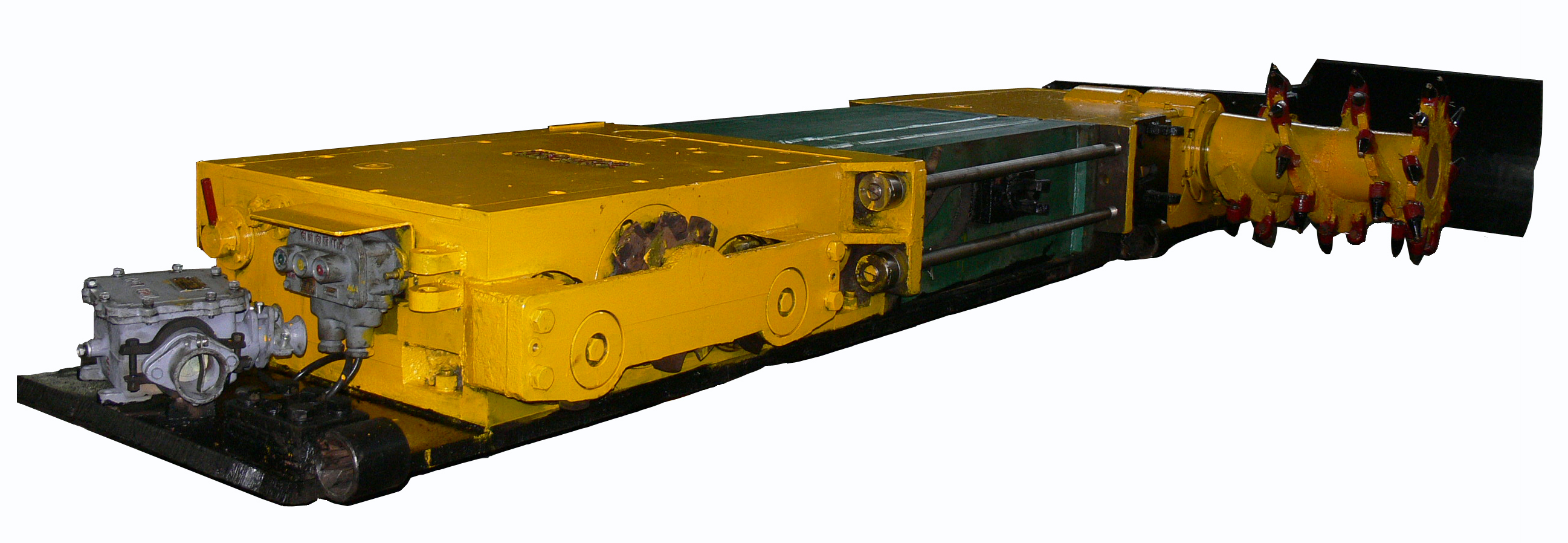 MG100-TP(YRG3)型極薄煤層單滾筒爬底板采煤機。機身矮、短、窄,機身高度380mm(局部425mm含底船),機身長3848mm,機身寬910mm,用于煤層厚度為0.5~0.9m,煤質(zhì)中硬(f≤3),傾角<300的煤層,當傾角>150時,機器要增加防滑絞車。