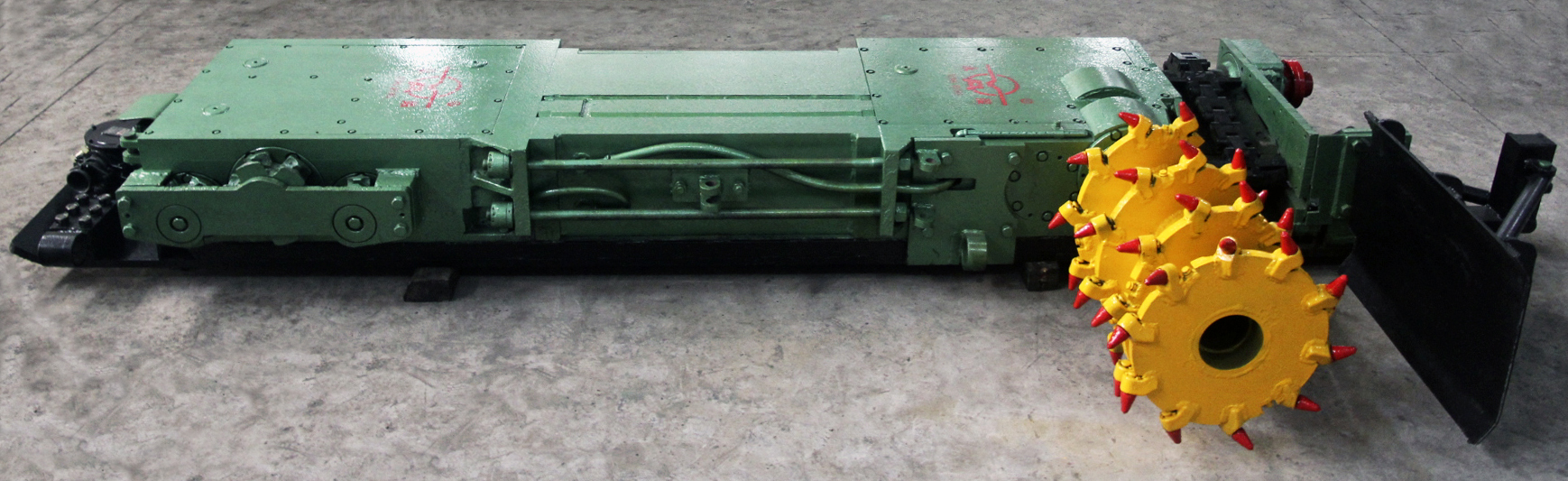 MG100—TP(YRG4型)型極薄煤層單滾筒爬底板采煤機(jī)。該采煤機(jī)適用于煤層厚度為0.5~0.95m,煤質(zhì)中硬(f≤3) 傾角<30°的煤層,當(dāng)傾角>15°時(shí),機(jī)器要增加防滑絞車。該機(jī)采用液壓傳動(dòng)、錨鏈牽引、無(wú)極調(diào)速,操作簡(jiǎn)單。該機(jī)與SGD420/22或SGB420/30型刮板輸送機(jī)、單體液壓支柱配套使用,具有功率大,整機(jī)強(qiáng)度高,可靠性高,安全有保障等特點(diǎn),可實(shí)現(xiàn)極薄煤層普采工作面機(jī)械化開采。