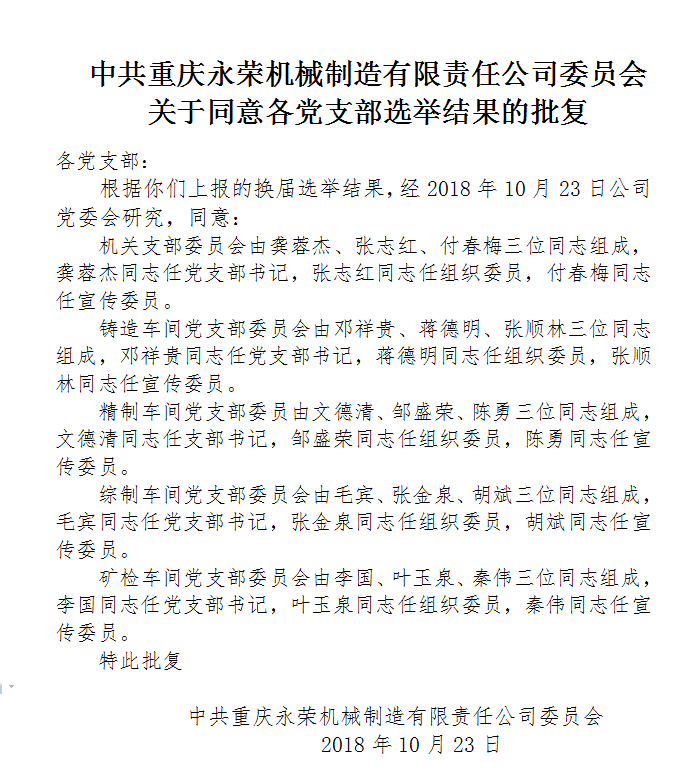 10月,永榮機(jī)制公司黨委下屬五個(gè)黨支部?jī)赡耆纹趯脻M,按照相關(guān)規(guī)定,各支部分別召開(kāi)黨員大會(huì)進(jìn)行換屆選舉。截至10月底,各黨支部順利完成選舉任務(wù)。圖為選舉結(jié)果。